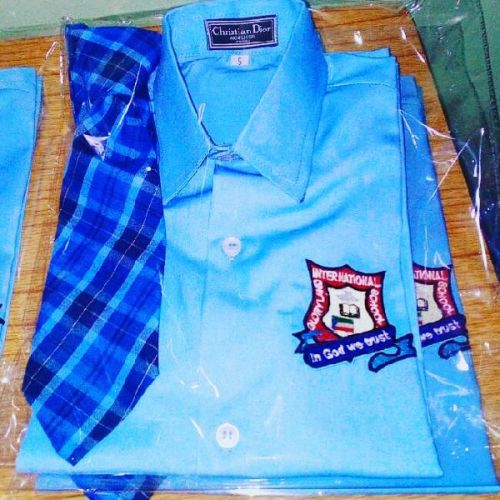 neatly manufactured school shirt with gabadine fabrics with check tie, british standard sewing, and well manufactured in different sizes and coors.