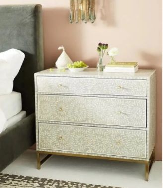 This handcrafted bone inlay media cabinet combines functionality with vintage charm. Featuring intricately patterned bone inlay, brass hardware, and an Art Deco-inspired design, it’s a luxurious statement piece for your living room. Crafted from durable wood, resin, and polished brass, each unique piece showcases subtle variations due to its handcrafted nature. Sealed with resin for added protection, it’s easy to maintain with a simple damp cloth.