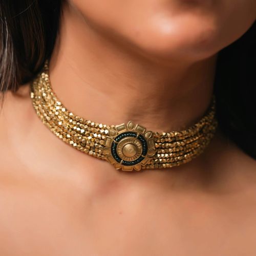 Contact SupplierINSPIRATION: • A festive collection by AAREE that shines bright, is full of sheer elegance and each piece defines timeless beauty in its own magical way. Each jewellery piece in Sehr Collection speaks volumes of enchanting feminine energy and royalness; having statement yet elegant pieces in the collection it 's going to make every single woman special and confident. DESIGN: • Every piece of jewelry always has a story and we are suckers for them. This stunning piece of craft in the form of the beautiful beads dressed choker was actually inspired by a client of ours who wanted it for her wedding. Pair the choker with well cut dresses, hair tied sleek and a bold lipstick for an old school glam look. Finish the look with simple stud earrings from the same collection for a more coordinated approach.