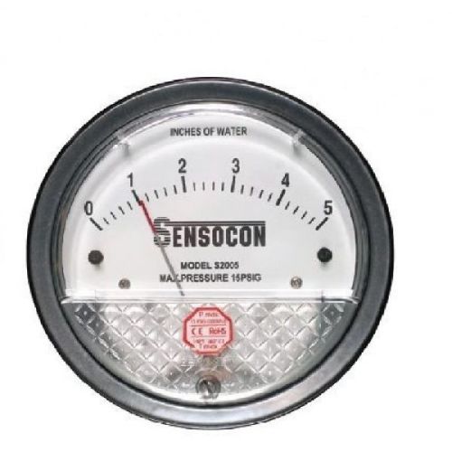 Sensocon Differential Pressure Gauge-S2000 series are low cost, diaphragm operated, mechanical differential pressure gauges that may be used in all applications for measuring positive, negative, or differential pressure with an accuracy of +/-2%. Applications: Pharmaceuticals clean room, Laminar Air Flow cabinets, HVAC, Biosafety cabinet, Measuring fan pressure blower pressure, Air velocity, Furnace draft, Pressure drop across orifice plates, Liquid levels in bubbler system, Pressure in fluid system and filter resistance