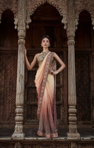 Designed In Ombre Hue, Our Pre-Draped And Pleated Saree Is Paired With A Blouse Embellished To Perfection With Beads And Sequins.