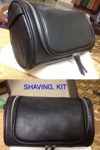 We offer shaving kit. Made from cow veg tan leather - colors: black cognac choco brown navy rosso suitable for frequent traveller. Packed in white plain box