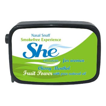 She Snuff Products are Specially Designed Looking to Need of Woman.delicately Flavored and Available in Trendy Pack Which Can Go with Woman�s Accessories. This Snuff Has a Great Enjoyable Fruit and Flower Flavors with Light Menthol Scent .it Has a Medium Grind and is a Medium Moisture Snuff Making It Very Easy to Take,Even Large Pinches!the is Noticeable and the Base is High Quality.try Some Today,You Wont Be Disappointed
