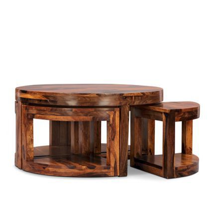 Features : Coffee Table Height - 18 inches (45 cm) Diameter - 35 inches (88 cm) Stool Height - 5 inches (38 cm) Length - 22.6 inches (57 cm) Width - 16 inches (40 cm) Material : Sheesham Wood Finish : Walnut