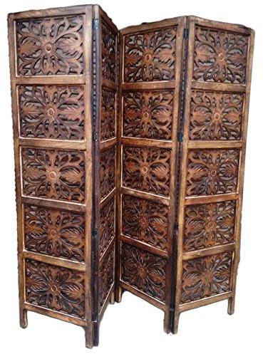 Foldable room partition screen dividers 4 panels to be placed in zig zag position size: 72" (height) x 80" (front width) inches approx. (each panel of 20 inch width and 72 inch height) primary material: seasoned mango wood note: size and color may be slightly different as it is antique hand carved product. Note: size and color may be slightly different as it is antique hand carved product. Note: octori charges specific to pincode areas need to bear by customer only.