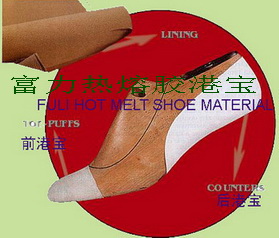 We offer Shoe Material,Toe Puffs, Toe Counters, Hot Melt Adhesive Sheet and chemical sheet. toe puffs & counters,hot melt adhesive sheet fj series toe box and counter advisable working condition: -temperature: 120 c about. -contact time: from 10 to 15 seconds according to the thickness of article. Applicable scope: sport shoeswork shoes, leather shoes etc. Thickness:0.8-2.0mm, package:36" 50 yards characteristic: high elasticity,excellent shape retention,high hardness,good wearbility.