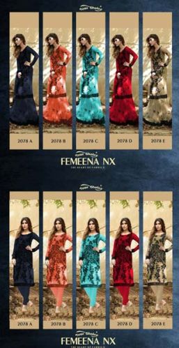 We are offering Specifications : CATALOG NAME : Femeena-NX FABRICS : Top:Fox Georgette 3.20 mtr | Bottom:Santoon 4.50 mtr |Dupatta:Pure Nazneen 2.30 mtr | Work :Embroidery. TYPE : Salwar Kameez TOTAL DESIGN : 5 MOQ :