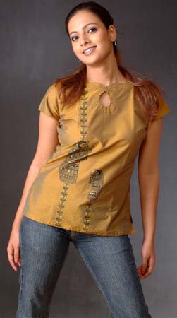 Short Top: The Madhubani painting on the goldenrod colored top with a key hole near the neck is rich with ethnic ideals yet is contemporary. Fabric: Washable Silk.