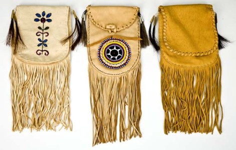 This 5' by 7" bag is large enough to be used on the shoulder but also small enough to go on the neck. It has a fold over flap that buttons with a tie. It comes in about most all colors of leather. We also have this with calf hairstill on. One of our best selling bags. Custom Beadwork or Quillwork can be done on this bag. This bag is 6 12" by 7" and has a large front flap that covers the whole bag. it is either Beaded or Quilled. Covering the bottom it is fringed. Made from deer hide. Comes in Gold, Smoke,