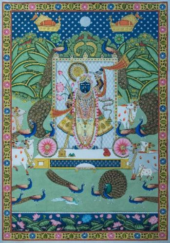 Hang this divine painting in your space and bring the essence of togetherness! This appealing Pichwai artwork depicts Shrinath Ji waiting for the Gopis to commence Raas Leela, their spiritual union. Thus, signifying the auspicious onset of Sharad Purnima.