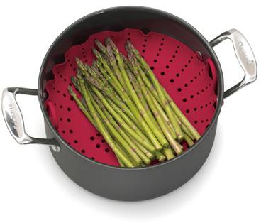 That old metal clunker? See if it can be recycled, because there’s a new steamer in the cabinet. With its sleek lines and expanded surface area, the SleekStor™ VeggiSteam™ is a steaming revolution. Product Features: • Modern non-stick design protects surfaces of pots and pans • Heat and stain resistant silicone • Product is heat resistant up to 400° F (204°C) • Safe for microwave use • Top rack dishwasher safe Always use with water. Never use in a dry pan.