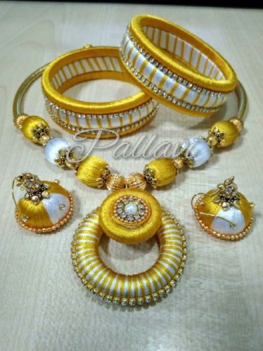 Handmade Silk Thread Traditional Necklace with stone work double layer pendant. A pair of matching Jhumka and a pair of kada suitable for Party wear and Traditional wear. Colors and size can be customised as per requirement. Retail and Bulk orders also accepted.