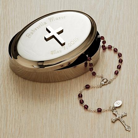 Inspirational gifts keep that unforgettable moment alive forever. Oval keepsake box is lined with black felt to protect valuables. High-polish silver-plated piece has a lovely raised cross accent. Engrave with any 2 lines, up to 25 characters per line. Keepsake box measures 2 34" H x 4 12" W x 1" D. Rosary not included. Item