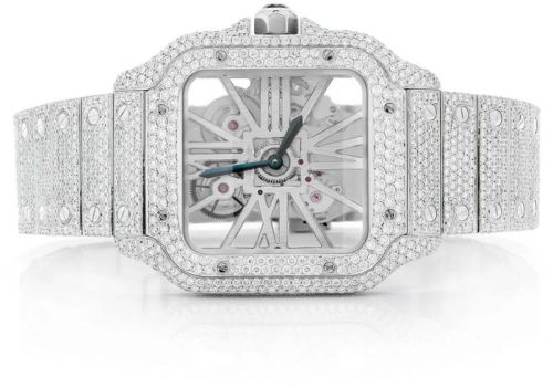 Contact SupplierSantos de Cartier 38mm Silver Tone Skeleton Fully Iced Out Hip Hop Diamond Watch - 21.00ctw Craftsman Iced Watch Brand: Cartier Model: Santos de Cartier Skeleton Dial: Skeletonized with Exposed Movement Case Size: 38.00mm Case Material: Stainless Steel with Full Diamond Set Bezel: Fully Iced Out Bracelet: Full Diamond Studded Strap Total Carat Weight: 21ctw approx. Functions: Hours, Minutes, Seconds Design: Iconic Santos de Cartier Skeleton Case with Opulent, Transparent Detailing Cartier Santos de Cartier Skeleton features a 38mm stainless steel case with a captivating skeletonized dial that showcases the intricate mechanics within. The bezel is fully iced out, providing a dazzling and sophisticated edge, while the full diamond-studded strap, with approximately 21.00 carats of diamonds, adds a touch of opulence. This timepiece beautifully merges Cartier's classic design with luxurious detailing, making it a standout piece for any collection.