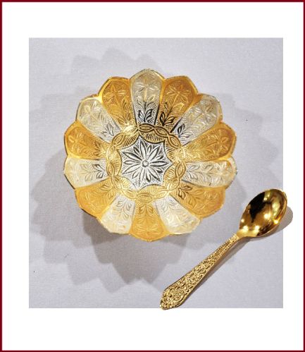 This set of single designer golden vati with spoon which is delightedly carved and manufactured from qualitative combination of copper-brass metal plated with golden plating that sparkles like sun rays and looks like golden coloured lotus with silver shimmering. It can be used to serve desserts and other dishes that make an impressive impression on the frontier. This is having a captivating look and fantastic finishing.