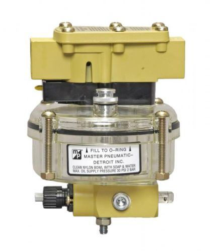 Servo-Meter: The servo-meter is an air-actuated, positive displacement oil pump. It injects oil with each signal from the pulse counter. To actuate the servo-meter the signal received must have a pressure of at least 60 psig (4 bar). When actuated a precise amount of oil is delivered to nozzle in the outlet port of the flow valve, and is then carried by a nylon line to the air tool. A transparent sight indicator on one end of Servo-Meter gives visual verification of oil delivery.