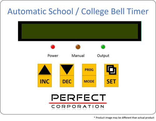 Contact SupplierOur Automatic School Bell System is a simple yet robust. Schools, colleges, coaching classes, offices can use it for automatic bell ringing system. 25 types of bell settings (Periods) can be added for any day including Tea Breaks, Lunch breaks, short recess & Long recess & assembly. Bell duration can be individually set in seconds for example, short bell (3 seconds) and long bell (6 Seconds). There is also a provision for day selection viz Time Table can be defined same for all six days or same for Monday to Friday & special half day schedule for Saturday & Sunday holiday. Apart from automatic bell ringing it has a manual mode, which can be used in case of any deviation from predefined schedule or emergency use.