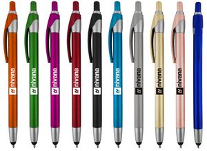 This Slim Jen Stylus Pen with its long slim body & click stylus pen has become one of the most popular pens in the advertising industry. Offered in several eye-catching metallic color barrels with silver trim, this pen is exclusive & unique! Black ink refills.