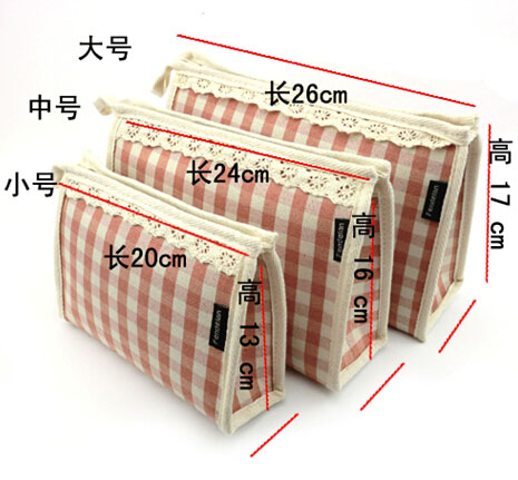 We offer Small Carrying Lace Cotton Cosmetic Bag Cosmetic Bag Bag Kit Pen Bag. Large: length:26cm highly:17cm Medium: length:24cm highly:16cm Small: length:20cm highly:13cm material