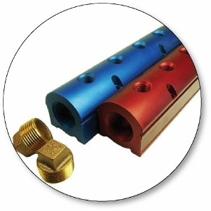Smartflow 34" NPT(F) inletoutlet manifolds have dovetail inter-locking channels, and pre-drilled holes for ease in pairing and mounting. Blue or red anodizing identifies supply and return water lines and protects against corrosion. Optional brass shut-off valves are expertly assembled onto each port. Manifolds not certified for use in potable water applications.