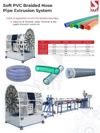 Soft PVC braided hose pipe production line consists of 2 extruders, die head, cooling water tank (MS/SS), haul off, high speed mixer, coiler machine etc. Pipe processing scope ф12-ф 250mm (½” to 10”), production capacity: up to 160kg/hr with specially designed screw and die head, inverter controlled ac motor, top brands electrical control units, the whole production line is stable in performance, excellent in quality. Suction hose pipe is mainly used for water supply in agriculture & irrigation and conveyance and delivery of waste, slurry, sludge, industrial and domestic water, chemical & gas supply, pneumatic system etc.