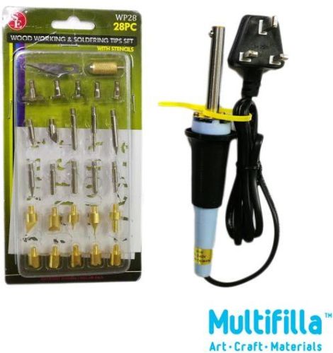 Wood and leather pyrography uses the same tool for wood burning for the former and branding for leather. 28 pieces interchangeable tool bits including a hot knife for foam carving. For a more prominent marking on vegetable tanned leather dampen the leather with a wet sponge. Allow to touch dry before designing with hot tool stamping. Similar use in wax carving for detailing and sculpting on candles.