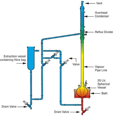 Contact SupplierThis is a semi-batch unit designed for solid-liquid extraction as a means of separation. The solid to be extracted is put inside a glass fiber bag and is placed in the extraction vessel. Solvent in the reactor is boiled and condensed, and passed to the extraction vessel, from where extract is mixed with the solvent and passes to the reboiler. The process is repeated until extraction is complete. Solution is again evaporated to obtain the extract. The unit is complete with spherical vessel, heating bath, condenser, reflux divider, extraction vessel, and necessary pipelines and valves. The unit can be supplied with solvent feed arrangement either from the top /or from the bottom, or with both arrangements. The unit is available in vessel size of 10, 20, 50, 100 Ltr.