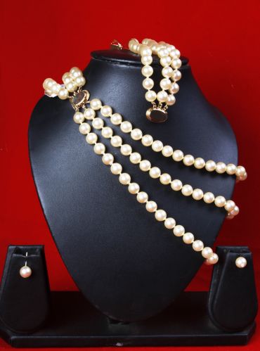 We Offer Jewellery, Pearl Jewellery, Necklace. triple Layered Queen's Necklace Along with Bracelet & Tops. Clasp is Made Up of Gold Plated Sterling Silver. Pearls Size is About 10 Mm.