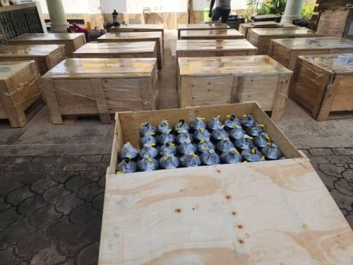 With 34.5 kg in each paper, packed in wooden boxes with 8 bottles inside