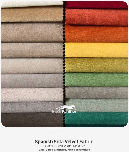 Contact SupplierOur Spanish Sofa Velvet Fabric is a luxurious textile designed to elevate furniture with elegance and durability. With a GSM of 180–220 and widths of 44” & 58”, this fabric is ideal for sofas, armchairs, and high-end furniture pieces. Its plush, soft texture offers a comfortable seating experience while providing the strength and resilience required for daily use. Perfect for interior designers, furniture manufacturers, and boutique decorators, Spanish Sofa Velvet adds a premium touch to living rooms, lounges, and commercial spaces. Available in a range of sophisticated colors, it blends seamlessly with modern and classic interiors. This velvet fabric ensures long-lasting beauty, ease of maintenance, and luxurious appeal, making it a preferred choice for discerning clients seeking both style and functionality in upholstery projects.