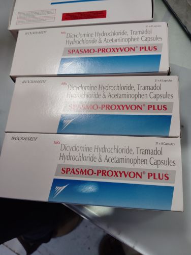 Spasmo-Proxyvon Plus Capsule is a combination of three medicines: Dicyclomine, Paracetamol and . This medication is used for severe pain relief. It works by relaxing the muscles of the stomach and intestine and stops sudden muscle spasms.