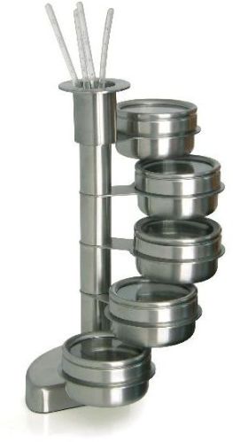 Your spices, sauces and spreads will become an elegant addition to your table. • Practical, takes up little space on your work-top • Totally mobile, the 5 pots can be passed around among your guests • Comes with 5 little serving spoons, kept at the top of the stand provided for this purpose, made from stainless steel