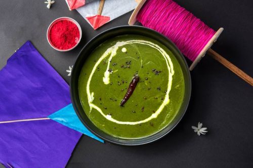 lohri special innovative combination of soup - the healthy soup with blanched sarson da saag, vegetable stock, seasoned with salt and pepper tempered with cream & punjabi garlic spices.