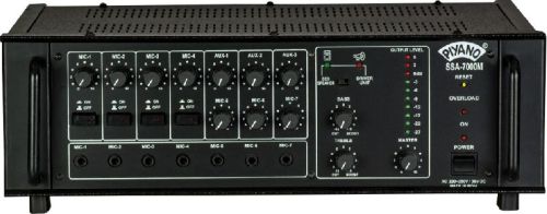900 WATTS MAX. AC & 36V DC OPERATION 7 Mic & 3 Aux Inputs Pre amplifier and line output for connecting to a booster amplifier and for recording the programme. Line input for connecting the output from any external Mixer or permitting SSA 7000M to be used as a Booster Power Amplifier. Resettable circuit breaker for protection against Overload and short circuit. Instant transfer to DC power (car battery) If AC power fails. Box Speakers Driver unit selector switch.