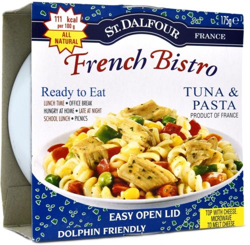 Tuna with Vegetables and cooked Pasta in an oil based dressing. Ingredients Tuna (25%), sliced carrots (17%), flat green beans (16%), red peppers (6%), sweeetcorn (6%), cooked fusilli pasta (4%), (Wheat, flour, eggs and water), celery (4%), onions (4%), peas (3%), virgin olive oil (2%), salt, mustard, basil, thickeners (xanthan and guar gums).