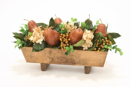 Hydrangeas, Berries and Pears in Stained Rectangular Wood Box Container Material Wood Dimensions Height" x Width" x Depth" 9 x 22 x 10 Dominant Color Ivory Dominant Color Family Neutrals Shipping Weight 28 Ships