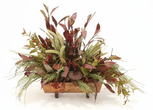 3410# - Fall Foliage, Grasses, Pods in Stained Rectangular Wood Planter Fall Foliage, Grasses, Pods in Stained Rectangular Wood Planter Container Material Wood Dimensions Height" x Width" x Depth" 26 x 34 x 20 Dominant Color Moss Dominant Color Family Greens Shipping Weight 10 Ships