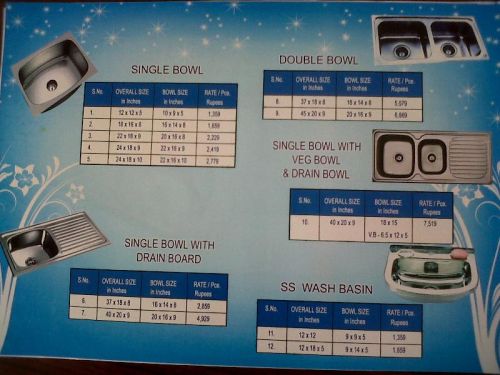 Contact SupplierA completely reliable range of stainless steel kitchen sinks is proffered by us. These stainless steel kitchen sinks are available in wide variety like single bowl, single bowl with drain board, double bowl with drain board etc. In addition to this, we proffer stainless steel kitchen sinks with double bowl (with vegetable bowl), single bowl (with vegetable bowl) and drain board etc. These elegantly designed stainless steel kitchen sinks are made with best quality steel and assure a long life. Perfect finish of our stainless steel kitchen sinks is capable to grace your kitchen in an exclusive manner. Furthermore, we offer very genuine prices for these excellent quality stainless steel kitchen sinks.regal – single bowl sink with drain boardoverall size (sizes in inches)bowl size (sizes in inches)18.5 x 32.5 x 6.514 x 16 x 6.518.5 x 37.5 x 7.514 x 16 x 7.520.5 x 45.5 x 816 x 20 x 8splendor – double bowl sink boardoverall size (sizes in inches)bowl size (sizes in inches)18.5 x 37.5 x 7.514 x 16 x 7.5