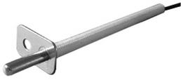 Glass encapsulated thermistor, housed in stainless steel sheath, with rectangle flange, round tip and 1 mounting hole.