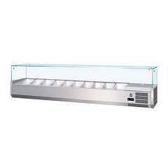 Stainless steel chiller display. glass counter 230 mm height.. cap: 5 gn containers 1/4 size.. temp: 2 ~ 10 °c.. gas refrigeration: r 134 a.. power: 220 v / 50 hz / 280 w. . net. weight: 33 kg.. dim: 1200 x 400 x 470 mm.