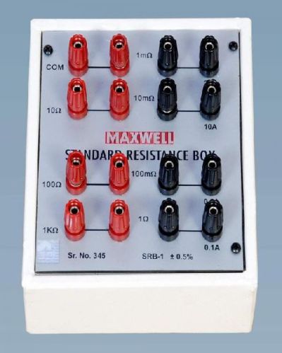 Standard Resistance Box : Model No. SRB-1  Accuracy 0.5 %  Used as reference standard To be used with Kelvin Double bridge or Digital Micro-ohm Meter Range 1 milli-Ohm to 1K Ohms, 7 different values,  7 different values of 1 mW, 10mW, 100mW , 1 , 10, 100 & 1KW Current ratings are for 1mW ( 20A),  10mW ( 10 A), 100 mW ( 0.1 A), 1W  ( 50 mA),  10 W  ( 10 mA ), 100 W ( 5 mA ) & 1 KW ( 1mA) Power Rating ( VI ) of all Resistors is approx. 0.5 Watts.