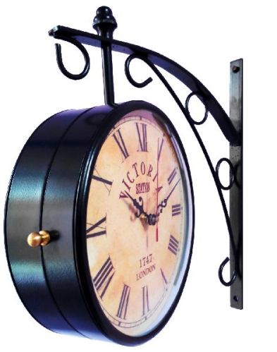 A unique black vintage station clock with detailed etching on metal body for your home. This is a double sided clock with a stand as shown in the picture. An ideal gift for for any occasion.