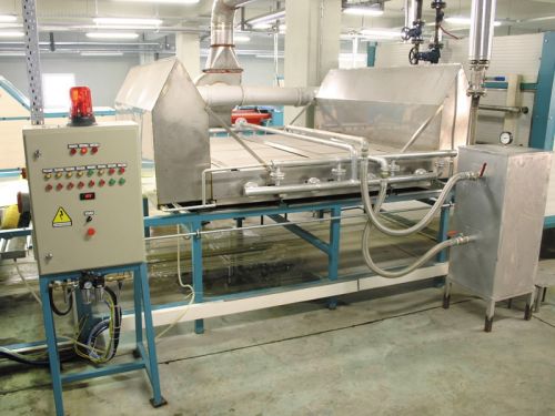 The machine can be used for bleaching of painted skins, tipping, fluorescence dying and all types of serigraphic printing. The machine consists of three main sections; steam preparing units, steam spraying units, exhaust system. Water is condensed and decomposed from saturated steam through one separate at the main steam entrance. After dry steam is fully decomposed at sensitive water traps in front of each group, it comes to flushing injectors.