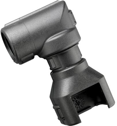 Hinged Connector Interface Fitting, Receptacle, 90 Degree Elbow with 360 Degree Swivel, 4-Way Ampseal Automotive Connector to Conduit, Conduit Size NC16/NW13, Operating Temperature -40 to 120 Degrees Celsius, RoHS Compliant, IP40 Rating, Very High UV Protection, Polyamide (Nylon), Black