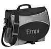Holds a 15" laptop. Large main compartment with built-in laptop sleeve. Front zippered pocket with media pocket and headphone port. Rear Velcro slash pocket. Side beverage pockets. Organization under flap. Removable, adjustable shoulder strap. Carry handle. 12" H x 5.5" W x 16.5" L