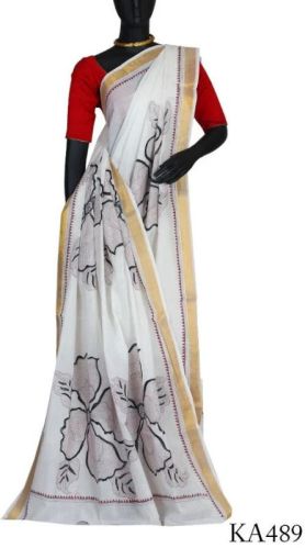 The Stylish Cotton Kantha Stitch Saree is now all the more glamorous thanks to the hand stitch work. This single coloured thread work enhances the beauty to the utmost level offering the perfect and the best look. The flower pattern work in different shades of colours adds a different flavor to this Kerala Cotton Saree bringing an uniqueness that is truly unparallel.