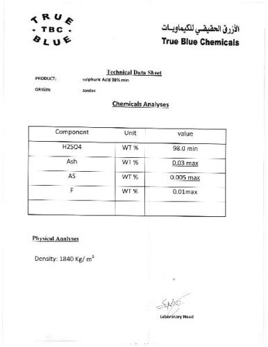 We are offering sulphuric acid 98% min. Technical data sheet product: sulphuric acid 98% min origin: jordan chemicals analyses component unit value h2so4 wt % 98.0 min ash wt % 0.03 max as wt % 0.005 max f wt % 0.01max