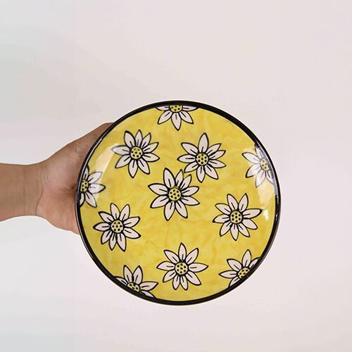 Brighten up your table with this vibrant ceramic plate, hand-painted with charming white daisy motifs against a bold sunny yellow background. The striking floral design is framed with a sleek black rim, giving it a modern yet playful look. Perfect for serving snacks, desserts, or appetizers, this plate also doubles as a delightful decorative accent.