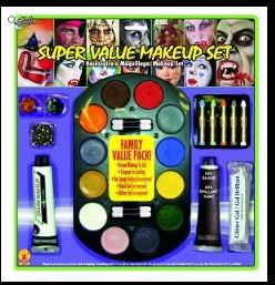 12 color washable makeup palette, washable cream makeup, 5 makeup sticks, fake blood gel, glitter gel makeup, fake skin, tooth blackout, makeup sponge, stipple sponge and sponge applicators.