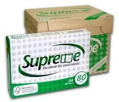 We are offering supreme excellent a4 copy paper 80gsm/75gsm/70gsm. Ream wrapped\r\nthickness: 80gsm\r\nwhiteness (cie): 164\r\nsize: a4\r\ncontains 5 x 500 sheet reams\r\n\r\nproduct specification\r\nbrand \r\ncompatibility copier\r\ninkjet\r\nlaser\r\ngreen product eu eco-label\r\ngsm 80gsm/75gsm/70gsm\r\nnumber of reams 5\r\nnumber of sheets 2500\r\npack type ream wrapped\r\npaper